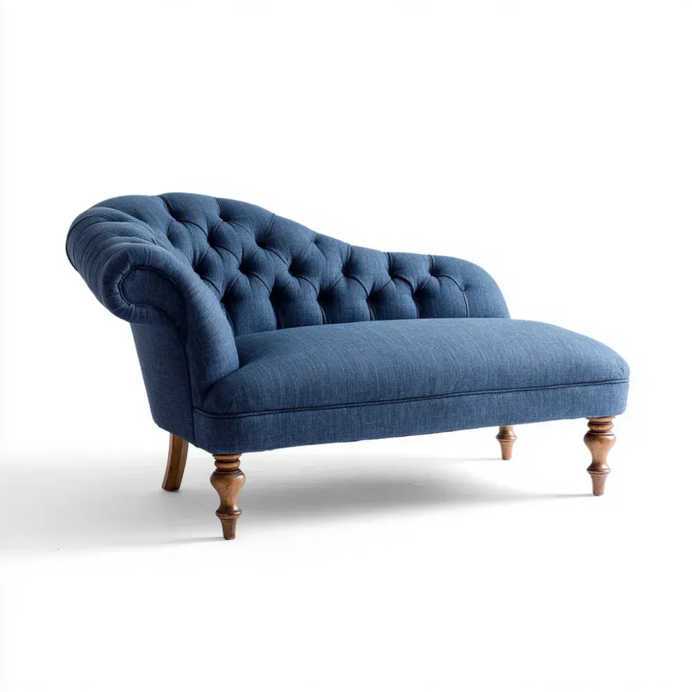 ダークブルーの高品質布製カバーと耐久性のある木製フレームを使用しています。手間のかかるボタンタフト加工が施されています。