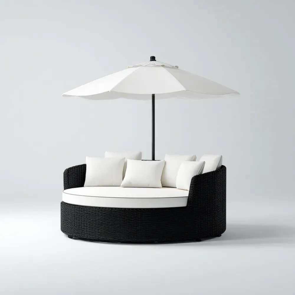 ラウンドガーデンリクライニングチェア 直径200cm 高さ120cm クッション付き - ブラック/ホワイト - パラソル付き