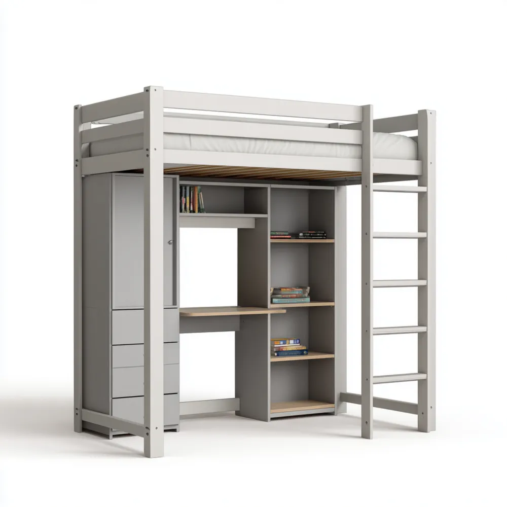 このロフトベッドは、スペースを有効活用できるスタイリッシュな選択です。書斎デスクと収納棚が一体となったデザインが特徴です。